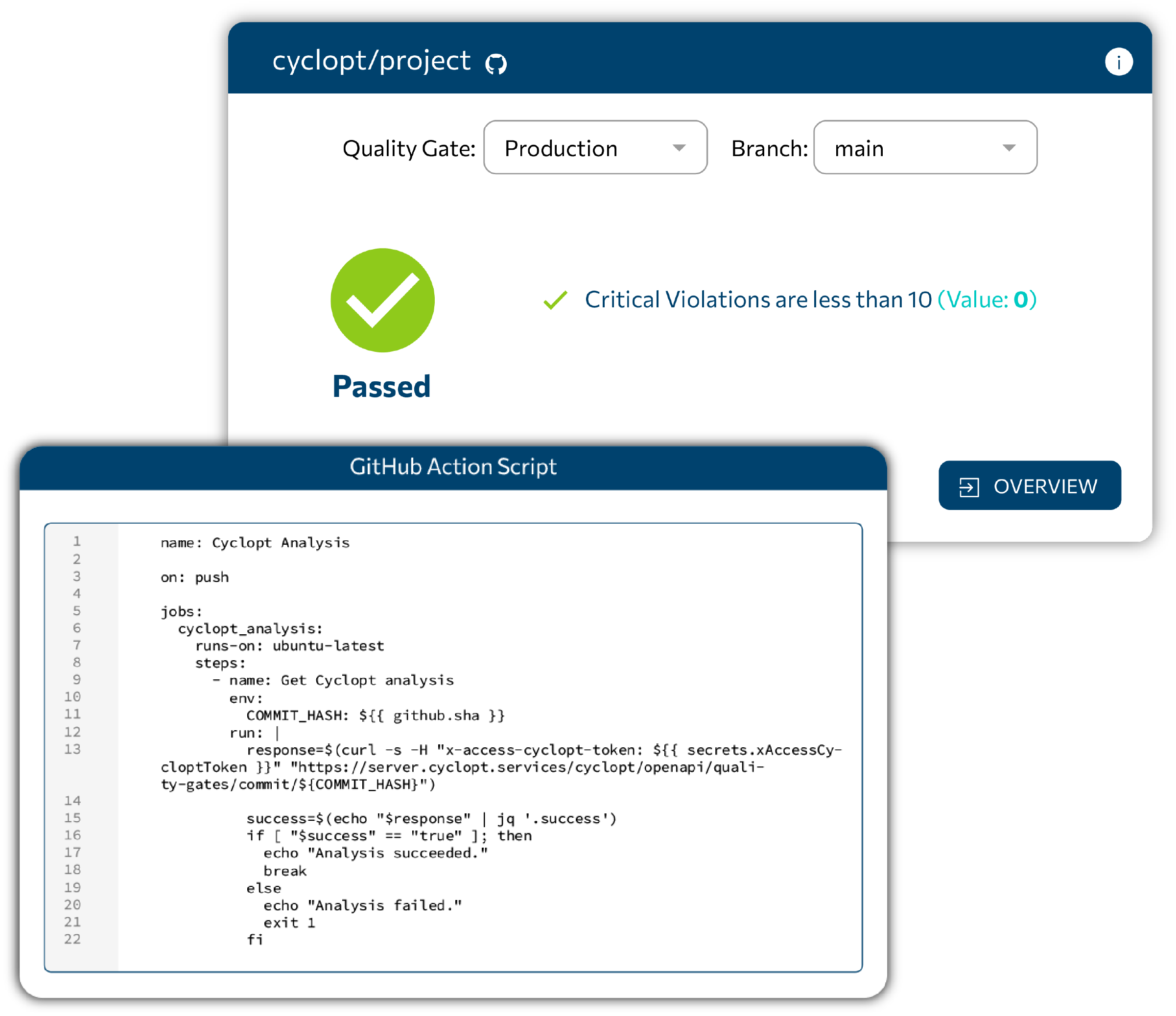 With Cyclopt Guard, you can define specific quality thresholds that your codebase must meet before integration or deployment. Be sure to adhere to coding standards, ensure proper documentation and maintainability/security criteria, and commit to progress in the development pipeline.